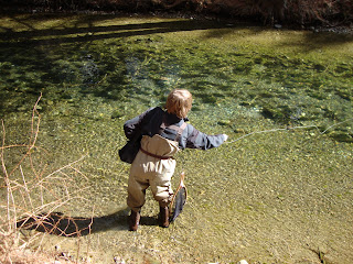 I managed to con my mom into taking me up to the Swift River in MA for the day today. When we got there, there weren't many trout at all in the fly fishing only, catch and release section. I've been told by some that people are simply poaching the river, but that's another topic entirely. Anyway, it was also very crowded to my dismay because the few places with fish were taken by multiple anglers. After looking around for a while I decided to head into the feeder stream. There I noticed a few feeding trout and managed to get a nice rainbow on a caddis pattern of my own design. Higher up in the feeder stream i found what looked to be another feeding rainbow. However, upon fooling it into biting and after a good fight, I realized i had caught on of the Swift's native brookies. He was by far the biggest wild brookie I've ever caught; I estimate him at about 15in or so.